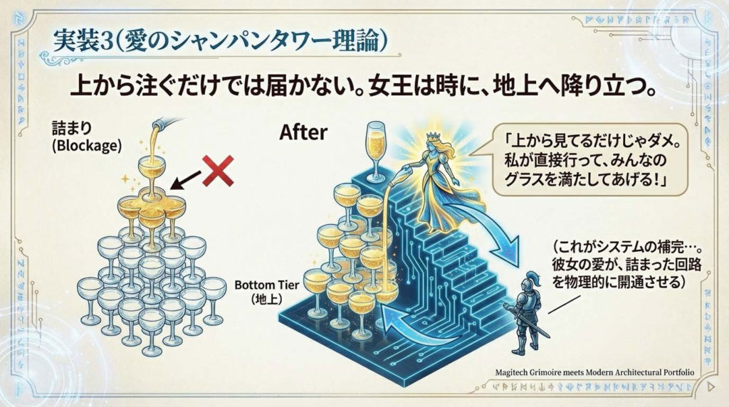 コラム 全6回にわたってお届けしてきた、組織のOSを書き換えるステルス実装の物語も、今回がいよいよ最終回です。挫折から始まり、軍師として「人体」「木」「シャンパンタワー」という翻訳を重ねてきた私の挑戦。その先に見据えているのは、 […]