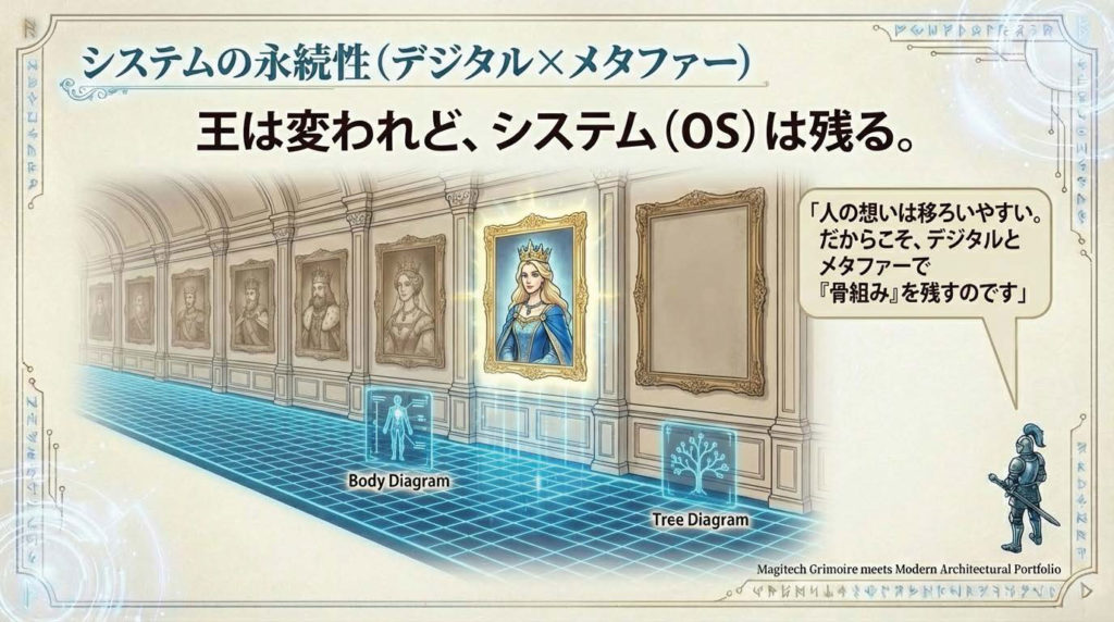 人の想いは熱く尊いものですが、時と共に移ろいやすい性質も持っています。だからこそ、私はあえて「人体図」や「木のメタファー」といった直感的なイメージと、デジタルによる情報の透明化をセットで導入しました。これらは一度定着すれば、属人的なスキルに頼ることなく、リーダーが誰に代わっても揺るがない組織の「骨組み」となります。